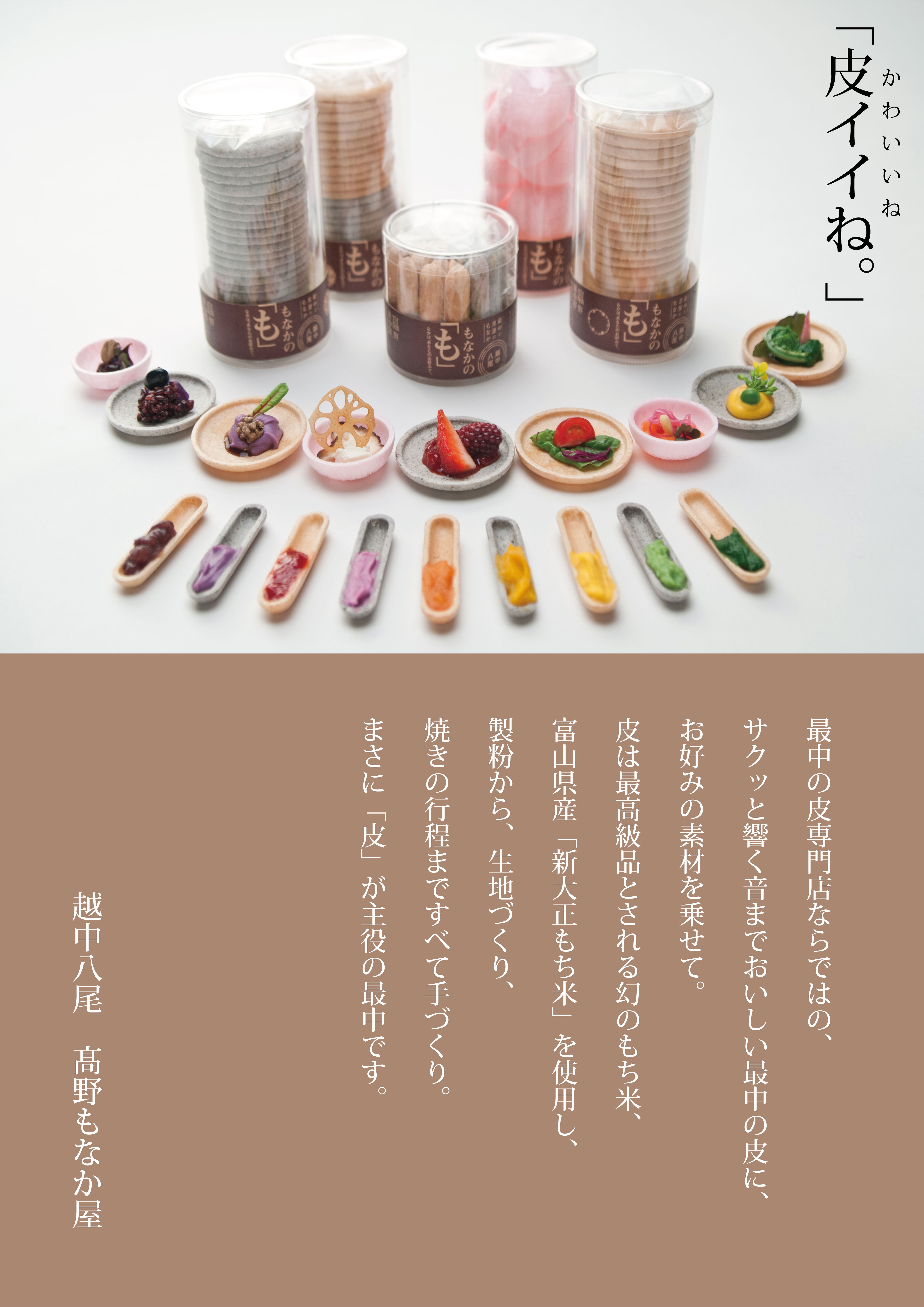 「おわら風の盆」で知られる富山県八尾町で、最中の皮の製造卸として創業以来、新大正もち米の製粉から生地づくり、焼き加減まで手作りにこだわってきました。